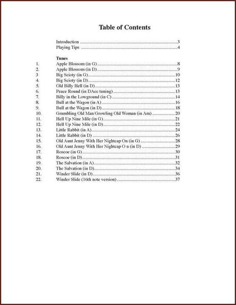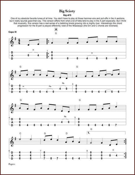 Almost all of the tunes are in D and DAD tuning. But if a tune is commonly played in another key, a version in its traditional key also appears in the book.