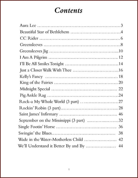 Aura Lee Beautiful Star Of Bethlehem CC Rider Greensleeves Greensleeves Jig I Am A Pilgrim I'll Be All Smiles Tonight Just A Closer Walk With Thee Kelly's Fancy King Of The Fairies Midnight Special Pig Ankle Rag Rock-A My Whole World (3 part) Rockin' Robin (3 part) Saint James' Infirmary September On The Mississippi (3 part) Single Footin' Horse Swingin' The Blues Wade In The Water-Motherless Child We'll Understand It Better By And By